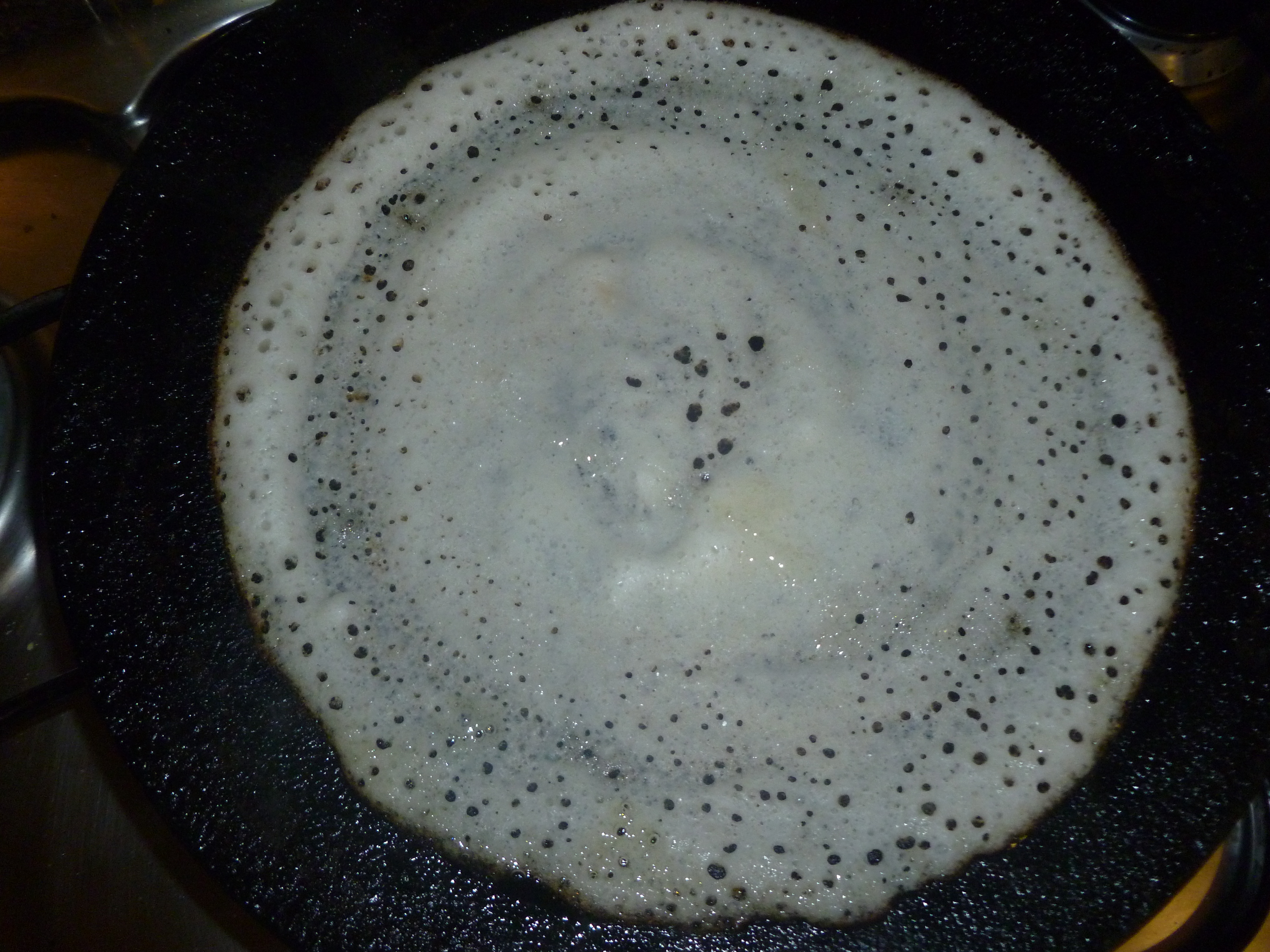தோசையின் மேல் பல பொத்தல்களுடன் ஈரப்பதம் குறையும்.