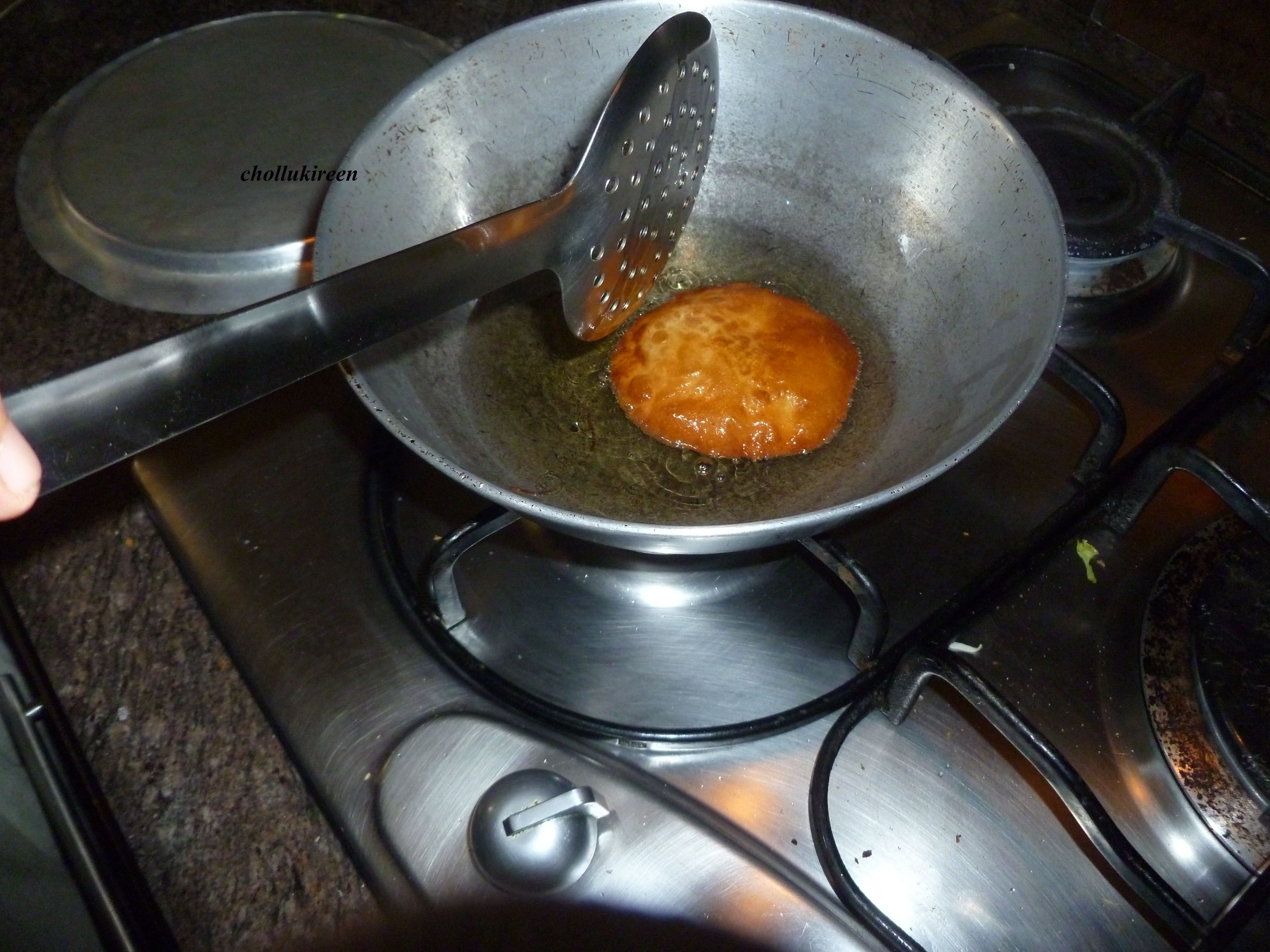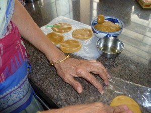 உருண்டையை எண்ணெயில் தொட்டுவைத்து வட்டமாகவும்