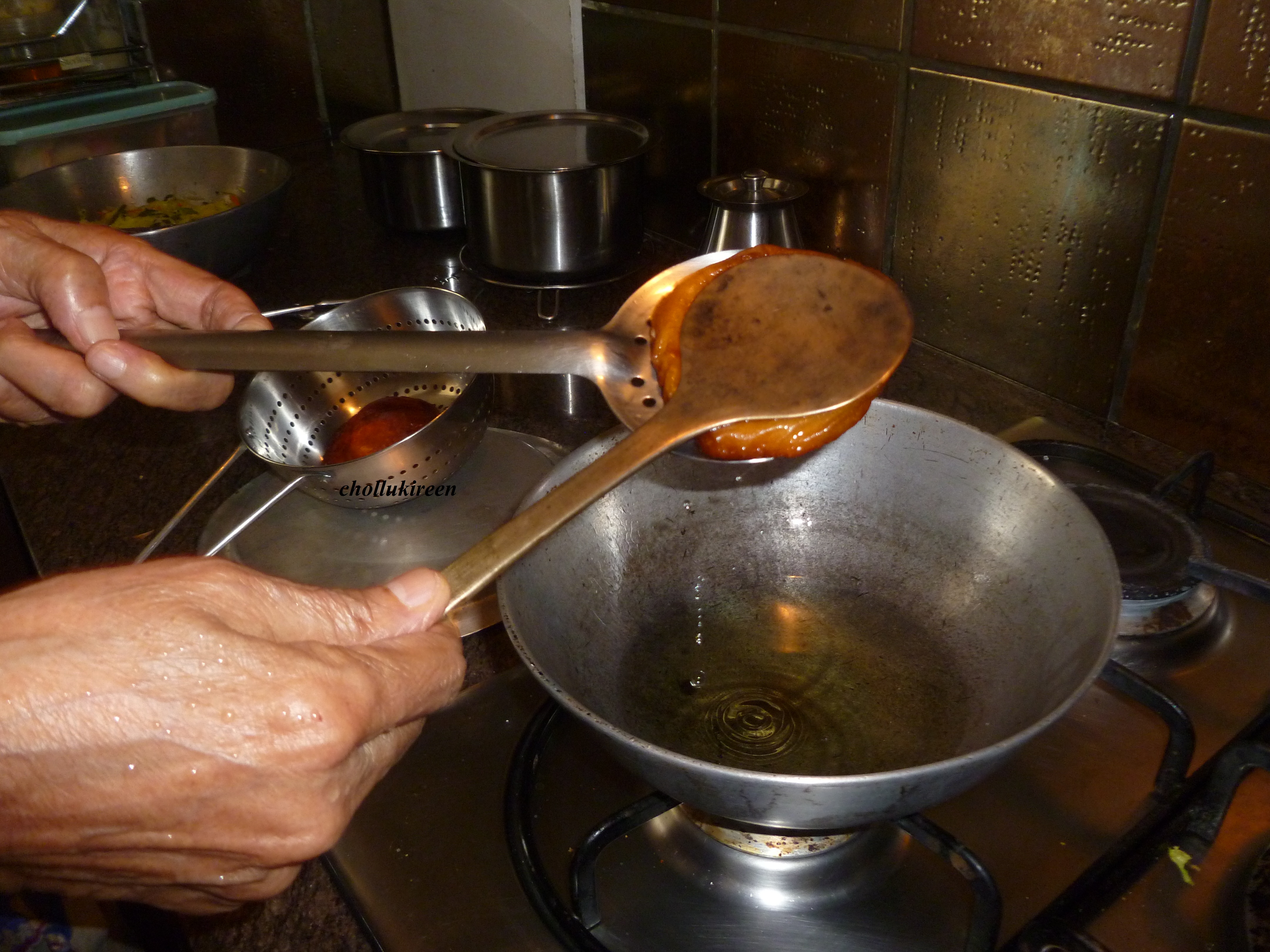 அதிரஸத்தை சட்டுவத்தில் வைத்தபடி ஒரு தட்டையான கரண்டியால்