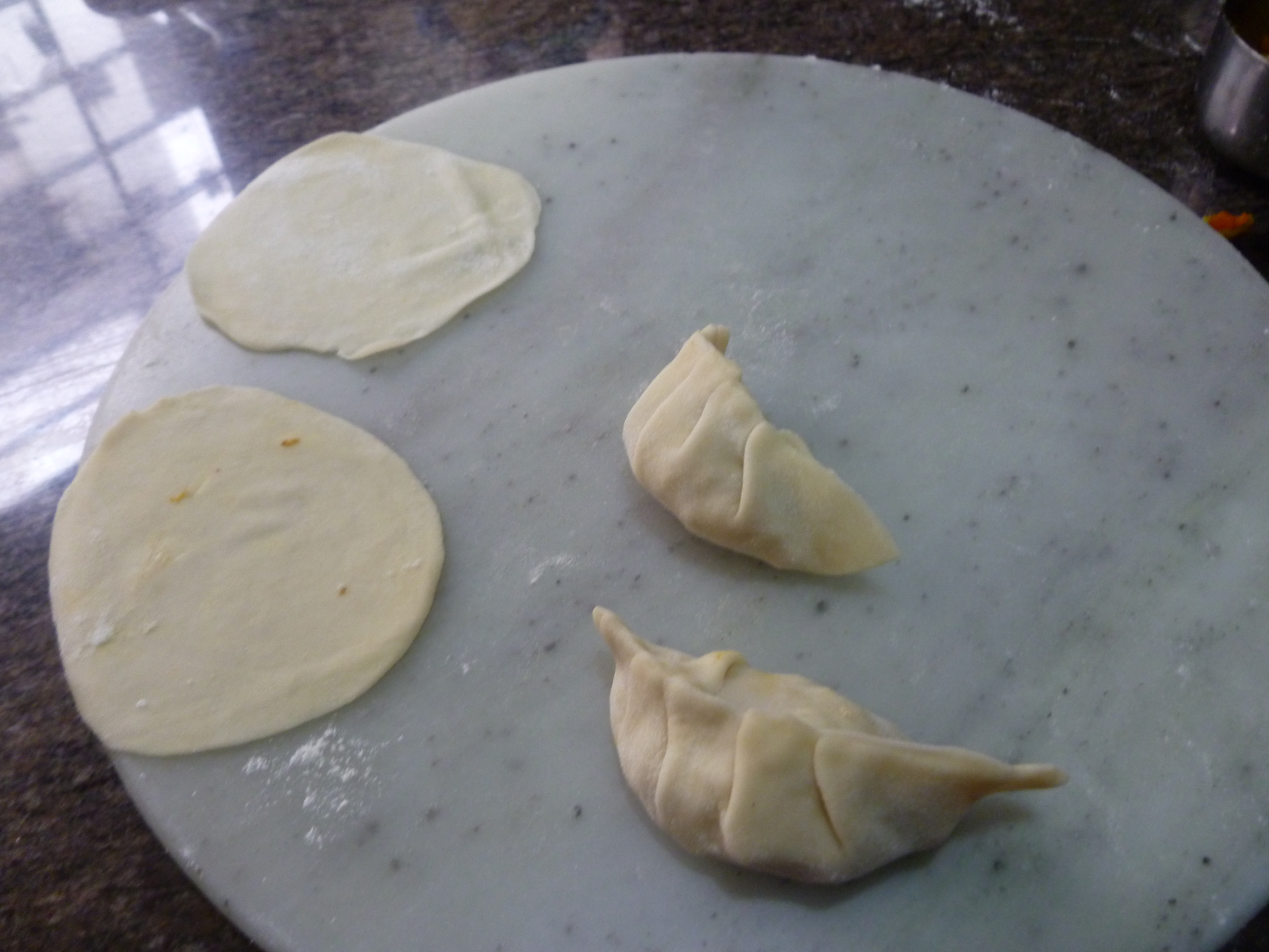 ஒவ்வொரு   வட்டத்தையும், கையிலெடுத்துக் குழிவாக வைத்துக் கொண்டு,நடுவில் சிறிது காய்கறி பூரணத்தை வைத்து  விளிம்பை ஈரவிரலினால் ஈரமாக்கி   மடித்து ஒட்டவும்.