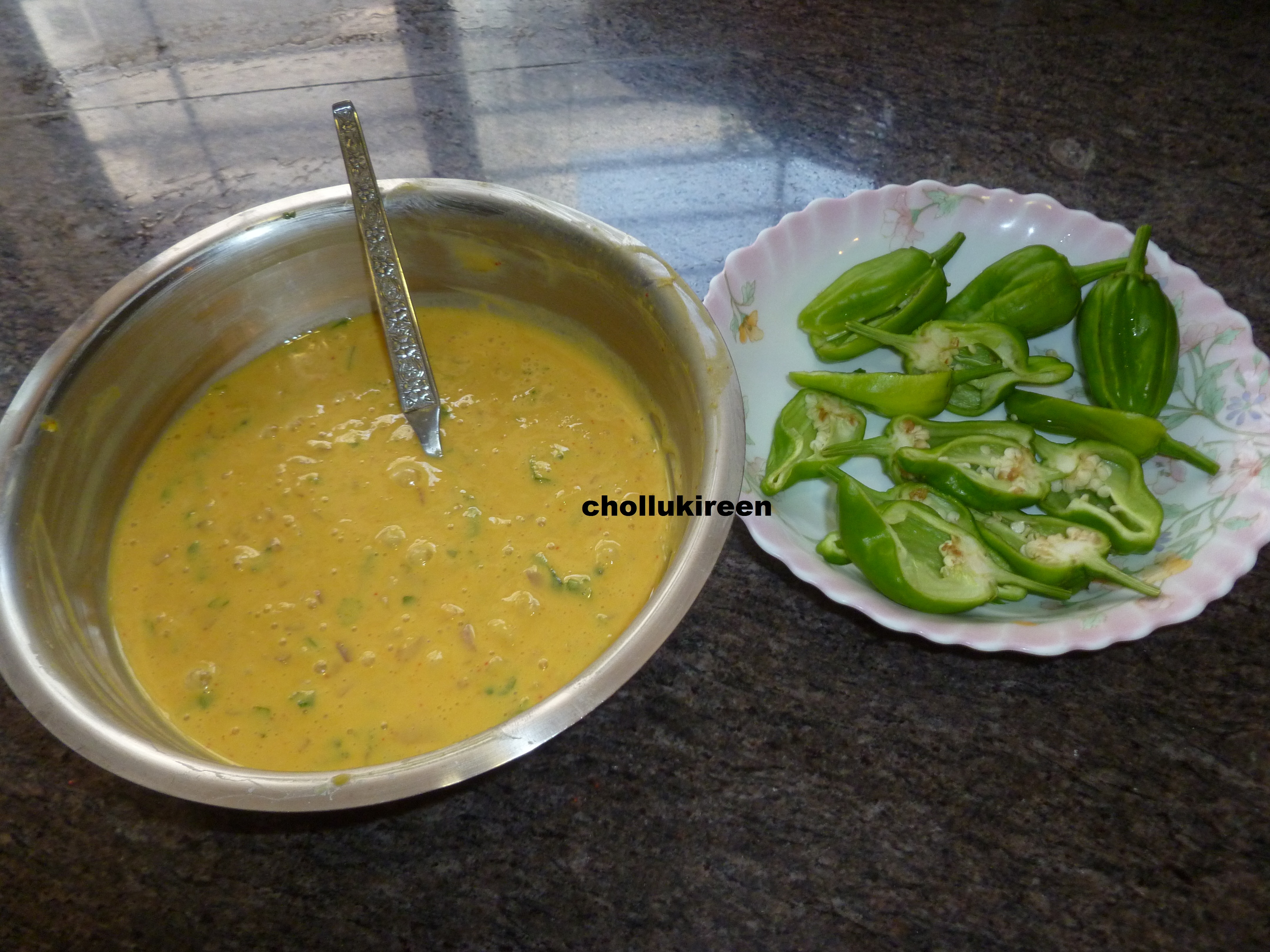 நடுவில் குட்டி காப்ஸிகம் பஜ்ஜி அதுவும் சுடச்சுட