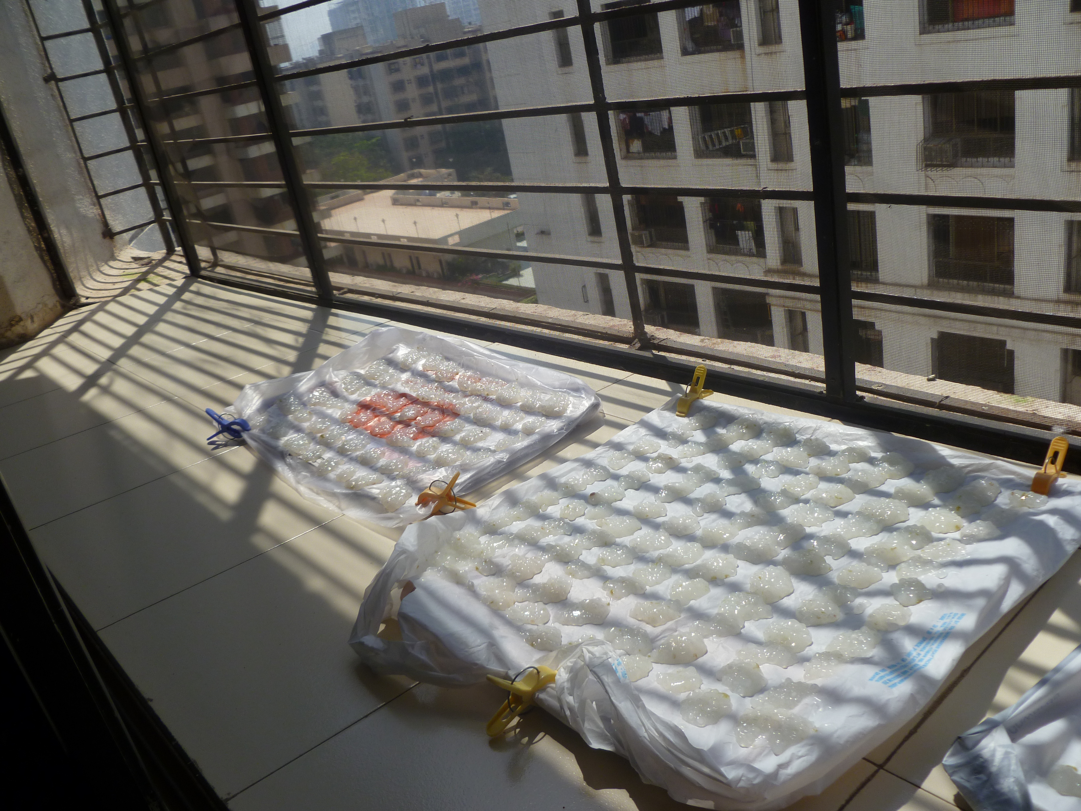 பாலிதீன் பேப்பர்களைச் சுற்றி வடாம் இட ட்ரேக்கள் தயார் செய்து கொள்ளவும்.